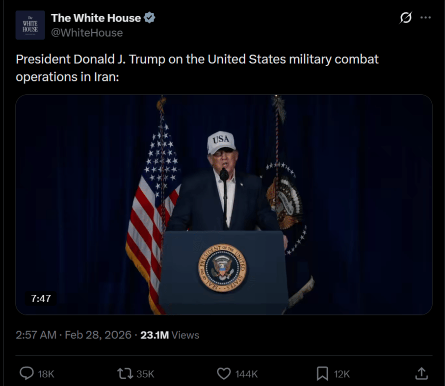 The media angle: this is the first major U.S. military operation where the primary information channels aren't CNN or broadcast networks — they're social feeds, group chats, and push notifications. President Trump announced the strikes in a prerecorded video posted to social media, not a live address from the Oval Office.