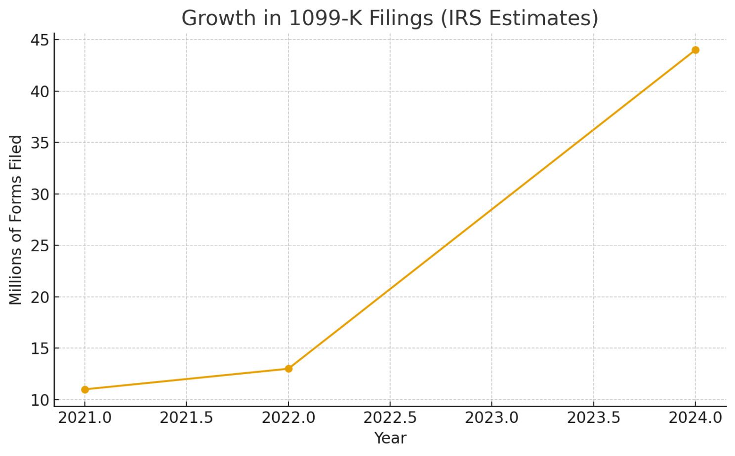 The IRS now estimates the number of 1099-K forms sent in 2024 will hit 44 million—nearly triple its earlier projection of 16 million. Before that, the IRS reported 11 million 1099-K forms in 2021, rising to nearly 13 million in 2022. The shift stems partly from lowered thresholds for reporting payments, which drew much more side work into official reporting.