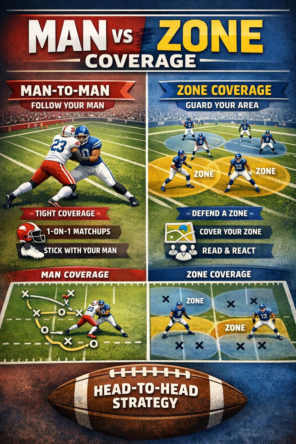 In football, coverage is how the defense sets up to stop your receivers. There are two main types: